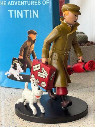 Figura coleccionable de Tintín de 19 cm y su fiel perro Milú. - Personajes icónicos de las aventuras de Tintín. - Base negra para exhibición.