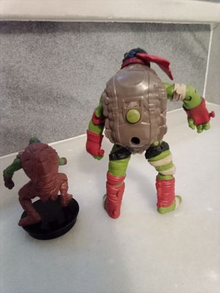 Figura de acción de la película live action de 2015, TMNT Out of The Shadow. Es la figura de Raphael in Wingsuit. Tenia un paracaidas que no se conserva, que se accionaba con el botón de atrás. La otra figura pequeña es un Leonardo de la pelicula anterior a esta, es un tapón para el agua. Las otras figuras ni las incluyo en el precio porque no tienen licencia, son mas piratas que Barbanegra de One Piece. Figuras bootleg que compraron en una conocida marca china creyendo que eran originales de Playmates.