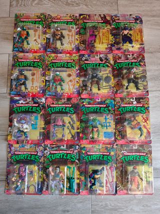 Colección de 16 figuras de las Tortugas Ninja de la línea Playmates, estilo retro. - Figuras de acción. - Empaques individuales. - Personajes icónicos de la serie. - Donatello, Raphael, Michelangelo, Leonardo, Splinter, Shredder, Rocksteady, Bebop, Krang, Baxter, Casey Jones, Genghis Frog, Rat King, Slash, Leatherhead, Mutagen Man. - Blisters sin abrir. TMNT.