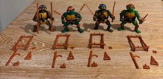 Lote de figuras de las Tortugas Ninja (TMNT) con sus accesorios. - Incluye cuatro figuras de las Tortugas Ninja. - Varios accesorios de combate y obstáculos.