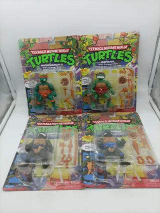Lote de figuras de acción de las Tortugas Ninja y su archienemigo Shredder. Ideal para coleccionistas. - Incluye 4 figuras. - Personajes icónicos de la saga. - Tienen cierta antiguedad Solo lo que se ve en las fotos Posible recogida en Sabadell Norte