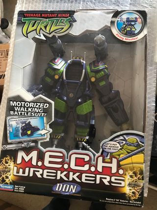 Figura de acción de Donatello de las Tortugas Ninja, parte de la línea M.E.C.H. Wrekkers. - Figura de Donatello en su traje de batalla. - Incluye detalles como Motorized Walking Battlesuit. - La caja muestra la frase Let's put the squeeze on the foot!. - Requiere 3 baterías AA (no incluidas). solo entrega en mano en valencia figura donatello no incluida