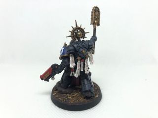 Figura de Primaris Capellán de Warhammer 40,000, pintada a mano. - Detallada armadura gris y detalles dorados. - Mazo de guerra con calavera. - Pistola bólter roja. - Base escénica con tierra y escombros. Ultramarine guilliman marine 40k warhammer Warhammer 40000 40.000 40,000 ultramar indomitus