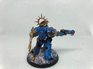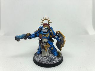 Figura de Teniente Bladeguard Primaris, pintada a mano. - Detallada armadura azul y dorada. - Halo dorado. - Escudo. - Arma de energía. Ultramarine guilliman marine 40k warhammer Warhammer 40000 40.000 40,000 ultramar indomitus