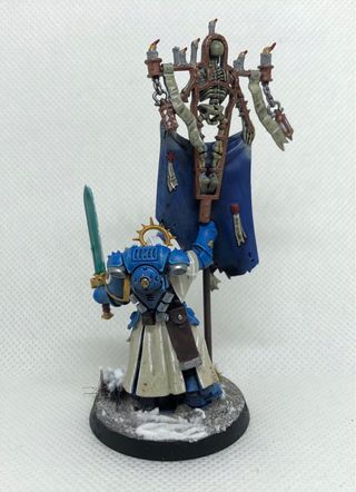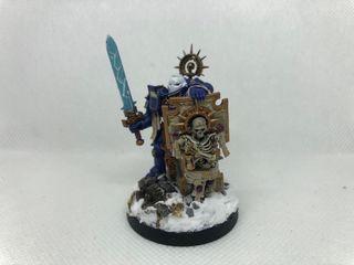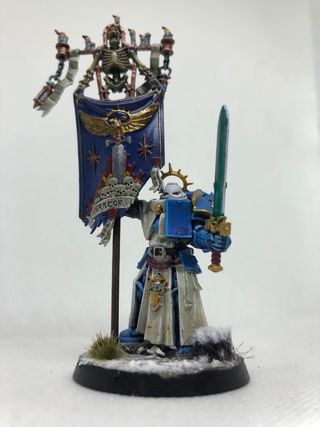 Figura de Capitán Primaris con un detallado escudo reliquia. - Pintura de alta calidad. - Base escénica con nieve y rocas. Ultramarine guilliman marine 40k warhammer Warhammer 40000 40.000 40,000 ultramar indomitus