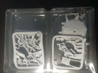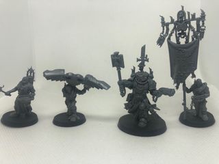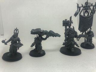 Figuras de Grimaldus y su séquito para Warhammer 40,000. Incluye varias miniaturas detalladas. - Grimaldus con martillo y pistola. - Portaestandarte con esqueleto y estandarte. - Figura con alas. - Figura con cuenco. Black templars templarios negros 40k 40000 40,000 40.000 warhammer Warhammer wargames marine primaris capellan chaplain