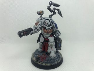 Figura de un Bibliotecario Primaris de Warhammer 40,000, pintada a mano. - Detallada armadura blanca y azul. - Arma de energía y escudo. - Base escénica incluida. 40k 40000 40.000 40,000 warhammer Warhammer marine primaris ultramarines dark angels blood guilliman