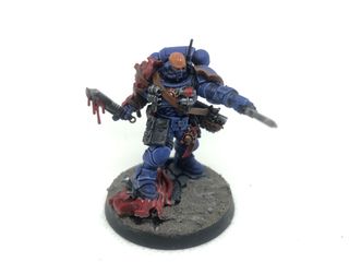 Figura de teniente de los Ultramarines con combi-arma. - Pintado con detalles en rojo y azul. - Base texturizada con efectos de sangre. 40k 40000 40.000 40,000 combi arma marine primaris guilliman ultra warhammer Warhammer wargames propainted combi weapons