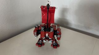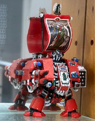 Figura de plástico de un Dreadnought de Warhammer 40,000. - Modelo de Marines Espaciales. - Pintado en rojo con detalles plateados y azules. - Incluye estandarte con diseño. - Figura de ángel en la parte superior. - sin usar guardado en vitrina siempre - figura de metal - 80 euros negociables