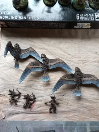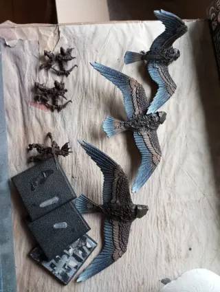 Figuras de halcones para juegos de miniaturas. - Set de 3 halcones. - Originales de plomo de Games Workshop. 3 por 50€, 6 por 90€ Capa de imprimación y capa base con aerógrafo. Fantasy, warhammer, elfos silvanos