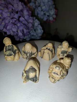 Conjunto de seis figuras de colección de China, datadas de los años 80. Representan personajes tradicionales con gran detalle. Dimensiones: 5, 4 y 3 cm de alto. - Material: Resina o similar. - Estilo: Figuras de souvenir. - Época: Década de 1980.