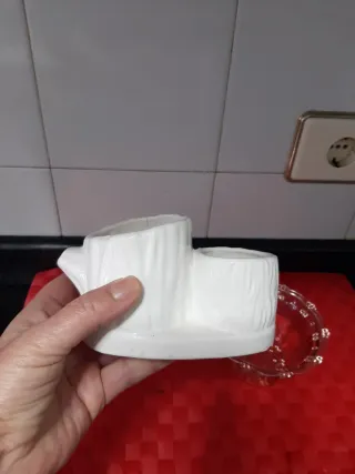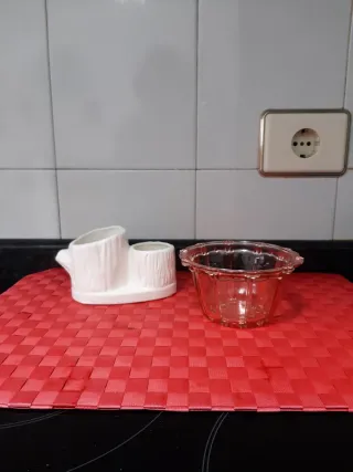 Conjunto de dos figuras decorativas. - Figura blanca con forma de tronco y dos compartimentos. - Recipiente de cristal rosado con borde ondulado.