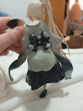Figura de Sora Kasugano, personaje de anime. - Kimono verde con detalles florales. - Abanico negro en la mano. - Cabello largo rubio recogido en coleta.