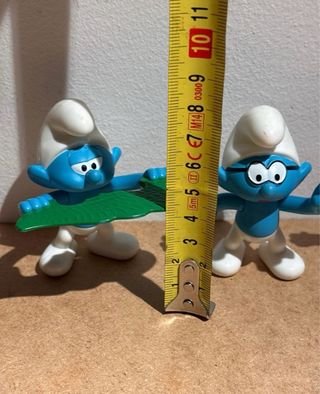 Conjunto de cuatro figuras de Pitufos de tamaño grande. Ideales para coleccionistas o para jugar. - Figura de pitufo con herramienta verde. - Figura de pitufo con gafas. - Figura de pitufo con camiseta roja. - Figura de pitufo con casco amarillo y peto.