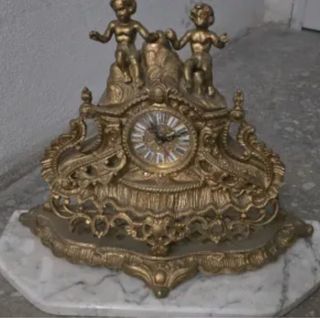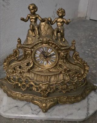 Precioso reloj antiguo de sobremesa, fabricado en bronce y con un diseño muy ornamentado. Presenta dos figuras de querubines en la parte superior. - Material: Bronce - Diseño: Clásico y detallado - Adorno: Figuras de querubines