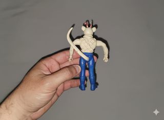La figura de acción que se muestra es de Baboo, un personaje villano de la serie original Mighty Morphin Power Rangers. Fabricante y Año: Producida por Bandai en 1993. Diseño: La figura es principalmente azul y gris con detalles dorados en el torso e incluye "huesos" blancos desmontables en la espalda y brazos que simulan alas o una estructura esquelética. Baboo es conocido en la serie como la mano derecha de Rita Repulsa, actuando como su alquimista y creador de pociones y dispositivos para sus planes malvados. A menudo se le representa junto a su compañero Squat.