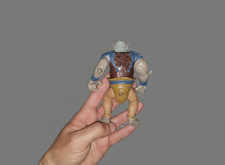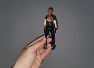 La figura es de Vinnie, uno de los personajes principales de la serie de animación de los años 90 Los motorratones de Marte (Biker Mice from Mars) modelo de la línea de figuras Super Bendables producido por Galoob en 1993, que se caracteriza por su material flexible. Marca Original: Galoob. Año de Fabricación: 1993. La figura es articulada y está hecha de plástico flexible. Viste pantalones y botas azules.