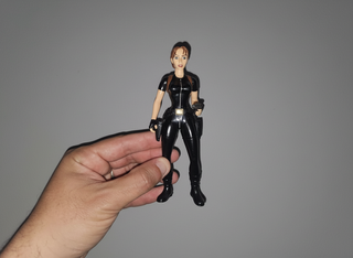 figura de acción de Lara Croft, el icónico personaje de la serie de videojuegos Tomb Raider. Esta figura en particular lleva un traje de cuerpo completo negro brillante y botas altas. La figura parece ser de la línea de juguetes Tomb Raider fabricada por Playmates Toys en la década de 1990 o principios de los 2000. Específicamente, el atuendo negro se conoce a menudo como el atuendo "London" de Tomb Raider 3, o el atuendo "Legend Black".