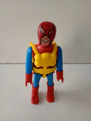 Figura de acción de Airgamboy con traje de superhéroe. - Cabeza y casco rojos con detalles. - Cuerpo azul con chaleco amarillo. - Botas y guantes rojos.