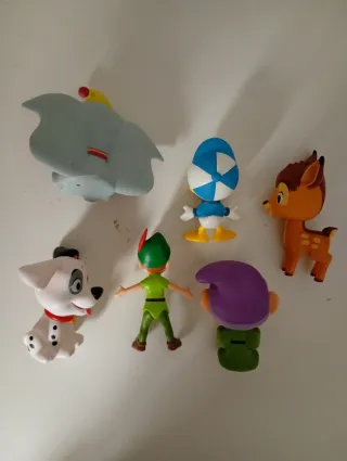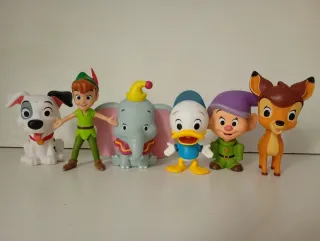 Lote de figuras de personajes clásicos de Disney. - Incluye a Dumbo, Bambi, Pato Donald, Peter Pan, un enanito y un perro dálmata. - Figuras de plástico. - Ideal para coleccionistas y fans de Disney.