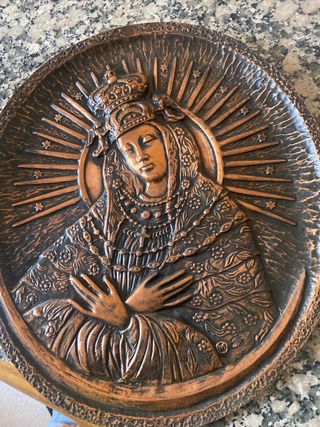 Figura decorativa de la Virgen de la Puerta del Alba. - Diseño en relieve con acabado en cobre. - Representación de la Virgen con corona y manto. - Detalles florales en el manto y borde. - Aureola con rayos y estrellas. tiene gancho para colgar!!!!