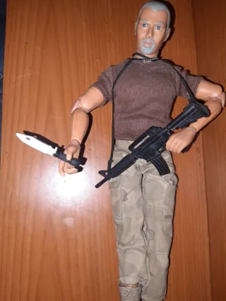 Figura de acción tipo GI Joe con accesorios. - Incluye rifle y cuchillo. - Ropa de camuflaje.