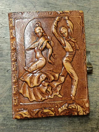 Magnífico monedero antiguo de piel con diseño en relieve de una escena taurina y una pareja de flamenco. - Elaborado en cuero repujado. - Detalle de escena taurina. - Cierre metálico.