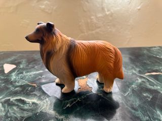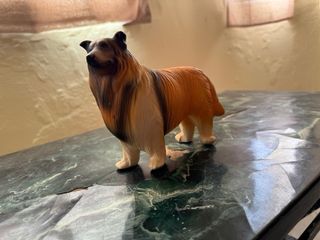 Figura decorativa de un perro de raza Collie. Detallada y realista, ideal para coleccionistas o amantes de los perros. - Diseño de perro Collie de pelo largo. - Colores realistas en tonos marrones y negros.
