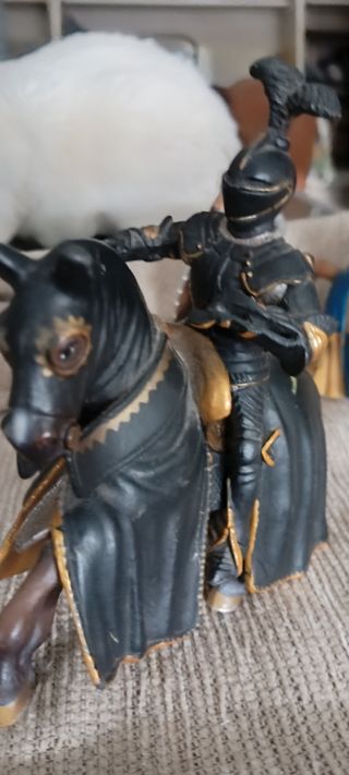 Conjunto de dos figuras de caballeros medievales, una montada a caballo y otra de pie. Ambas figuras son de color negro con detalles dorados. - Caballero montado a caballo. - Caballero de pie. - Detalles en color dorado.