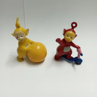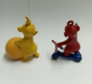Set de dos figuras de goma dura de los Teletubbies. Medidas: 9 cm de altura. - Figura amarilla con pelota. - Figura roja con patinete.