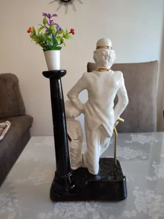 Figura decorativa de cerámica con acabado brillante, inspirada en Charlie Chaplin y un niño. El detalle dorado resalta el traje y el sombrero. - Figura de cerámica blanca. - Detalles dorados en traje y sombrero. - Base negra con textura.