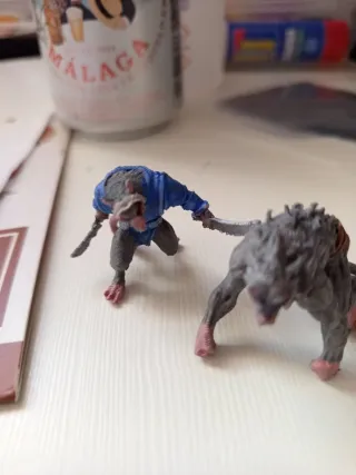 Dos figuras de ratmen, ideales para coleccionistas o juegos de rol. - Figura de ratmen con pelaje gris y detalles en marrón. - Figura de ratmen con vestimenta azul y gris, portando dos cuchillas.