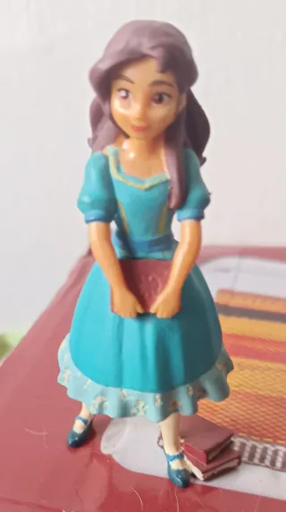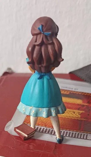 Figura decorativa de una niña con un vestido azul y detalles florales. Sostiene un libro rojo en sus manos. - Vestido azul con cinturón y mangas abullonadas. - Zapatos azules con lazo. - Base con dos libros pequeños.