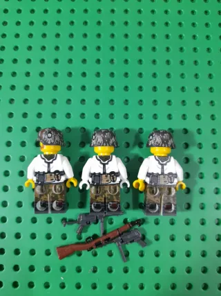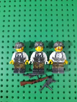 Conjunto de figuras de Lego de temática militar, con accesorios de armas. - Tres figuras de soldados con cascos y uniformes detallados. - Incluye tres armas diferentes: un rifle, una ametralladora y otro rifle. - Piezas originales de Lego.