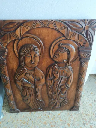 Importante tiene termitas se tendría que reparar. Bonito retablo de madera tallada con figuras religiosas. Escucho ofertas 51x39x3cm - Diseño con dos figuras y halos. - Marco decorado con motivos vegetales y geométricos. - Talla detallada en madera.