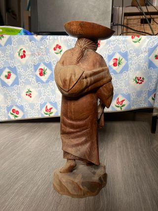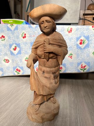 Figura decorativa de madera maciza tallada a mano, de estilo tradicional/costumbrista. Representa una figura femenina con vestimenta clásica y sombrero. Trabajo artesanal con buen nivel de detalle en el rostro y en los pliegues de la ropa. Pieza con carácter, ideal para decoración rústica, vintage o para coleccionistas de figuras de madera. Presenta desgaste y marcas propias del paso del tiempo, visibles en las fotos, que le aportan autenticidad. Altura aproximada: 45 cm Material: madera natural Estado: bueno Entrega en mano o envío por Wallapop. Precio negociable pero dentro de lo razonable