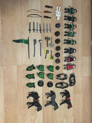 Conjunto de figuras y accesorios de Playmobil de temática medieval. EN BUEN ESTADO - 8 playmobil + 1 Esqueleto - 7 Cascos medievales - 7 Espadas - 4 hachas - 2 arcos y 3 de flechas - 2 lanzas - 1 bandera - 9 escudos medievales - 3 caballos con armadura playmobil VENTA EN PERSONA O ENVIO (HAGO ENVIO RAPIDO POR INPOST)