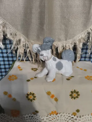 figura de porcelana Lladró 'Skye Terrier', referencia 01004643. Fue esculpida por Salvador Furió. Periodo de producción: La figura se lanzó originalmente en 1970 y fue retirada del catálogo oficial en 1985, lo que la convierte en una pieza "vintage" buscada por coleccionistas. Características: Es una figura de porcelana hecha a mano, que representa a un cachorro de Skye Terrier con manchas grises sobre un pelaje blanco. Mide aproximadamente 15 cm de alto y 17 cm de ancho.