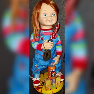 Figura de colección del personaje Conguito, sosteniendo una lanza. - Diseño detallado del personaje. - Color marrón oscuro brillante. - Labios rojos característicos. - Base con forma de ondas.