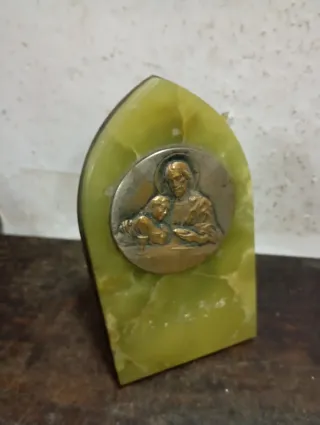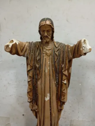 Figura religiosa de Jesús hecha de estuco. Presenta un diseño clásico con los brazos extendidos. Con desperfectos. Mide 26x10,5x8. Se aceptan ofertas. - Material: Estuco - Color: Tono tierra - Base circular
