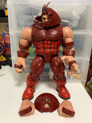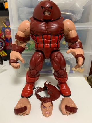 Figura de Juggernaut de Marvel Legends. Incluye accesorios intercambiables. - Cabeza alternativa. - Manos intercambiables. - Piezas de armadura adicionales.