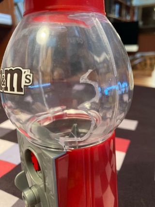 Divertido dispensador de M&M's con una figura de M&M's tocando la guitarra. Perfecto para coleccionistas o como un regalo original. - Figura de M&M's con bandana y guitarra. - Dispensador de M&M's con diseño clásico. - Tiene una grieta en el lateral