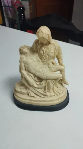 Réplica de la famosa escultura Pietà de Miguel Ángel. Representa a la Virgen María sosteniendo el cuerpo de Jesús. - Material: Resina - Base negra incluida