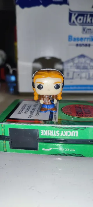 Figura coleccionable de Funko Pop con detalles de alta calidad. - Diseño de personaje con cabello rubio recogido en coletas. - Lleva auriculares negros. - Viste chaqueta marrón y pantalones azules. - Base de color verde con texto.