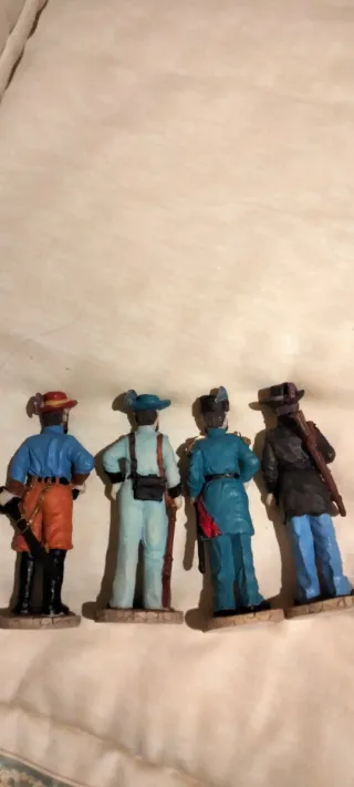 Conjunto de cuatro figuras decorativas de soldados de cerámica. Cada figura representa un personaje con vestimenta y sombrero distintivos. - Figuras de cerámica. - Diseño de soldados históricos. - Base individual para cada figura.