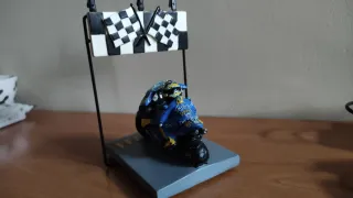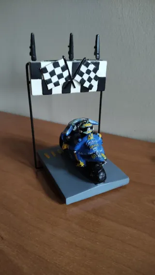 Solo se aceptan envíos 👉📦 🏁Figura decorativa del piloto de motociclismo Valentino Rossi en moto deportiva, representado cruzando la línea de meta con banderas a cuadros. 🏴Ideal para coleccionistas de motor, fans de las motos o como decoración para escritorio, estantería o vitrina. Material: resina/plástico pintado Colores predominantes: azul🟦 y amarillo🟨 Base incluida con escenario de meta Tamaño pequeño (figura de sobremesa) Estado: buen estado general, con pequeños signos normales del uso o del pintado artesanal (ver fotos) Pieza llamativa y original, perfecta como regalo o elemento decorativo. Precio 👉 10€