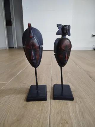 Dos figuras decorativas de madera con un diseño tribal. - Material: Madera. - Color: Marrón oscuro. - Base: Negra. - altura 27 cm aprox