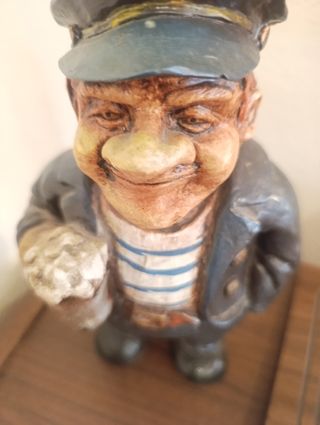 Figura decorativa de un marinero con gorra y traje a rayas. - Detalle de gorra azul con ribete amarillo. - Camisa a rayas blancas y azules. - Chaqueta oscura. - Rostro con expresión amigable.