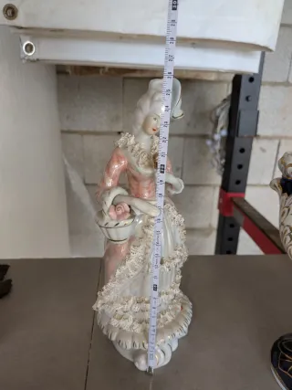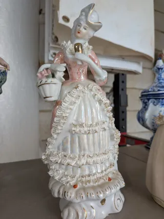 Figura decorativa de porcelana que representa a una mujer con una cesta en la mano. - Detalle de encaje en el vestido. - Acabados dorados. - Base ornamentada.