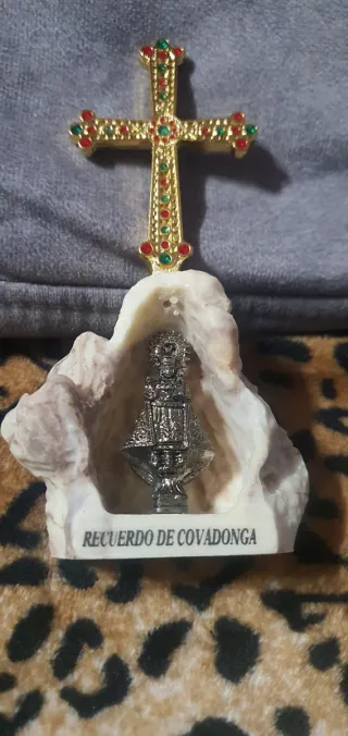 Figura decorativa Recuerdo de Covadonga con una cruz dorada adornada con detalles en rojo y verde. La figura de la virgen está expuesta dentro de una concha. - Figura de colección. - Cruz dorada con incrustaciones. - Base en forma de concha.